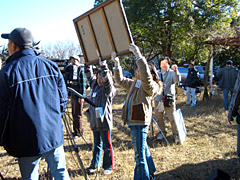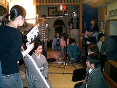 昨年の12月17・18日の研修(オリエンテーション、総合打合せ、衣装合わせ他)の後、23日から撮影に入り30日に前半を終了、本年は、1月5日〜9日無事クランクアップ。今回はなぜか参加者が女性ばかりで、小学6年〜高校3年の10名が、演出・技術・美術の各コースにわかれ大奮闘、カチンコをたたいたり、カメラの脚を運んだり、小道具を俳優さんに渡したり、と頑張りました。